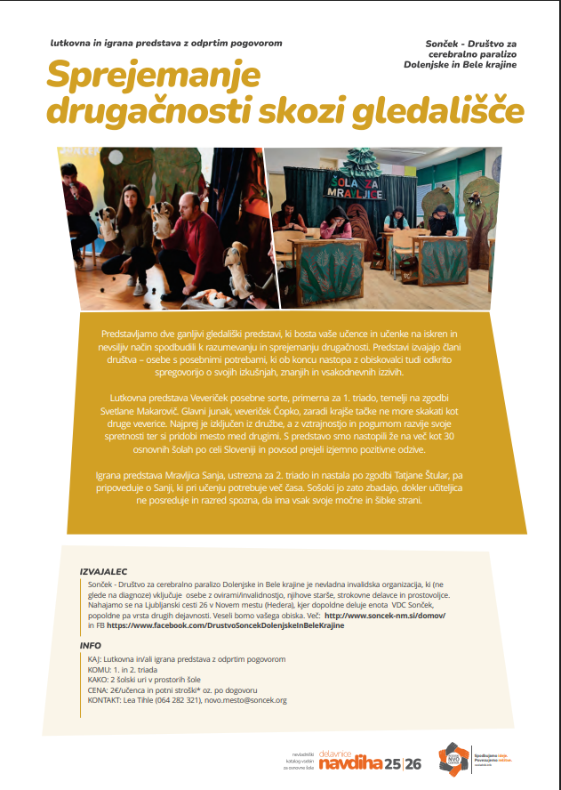 Tudi v šolskem letu 2025/2026 sodelujemo pri projektu Delavnice navdiha za šole z dvema gledališkima predstavama, Ja, kar dvema – eno povsem novo! Navdih, pogovor in srčnost skozi gledališče. Veselimo se vabila!
